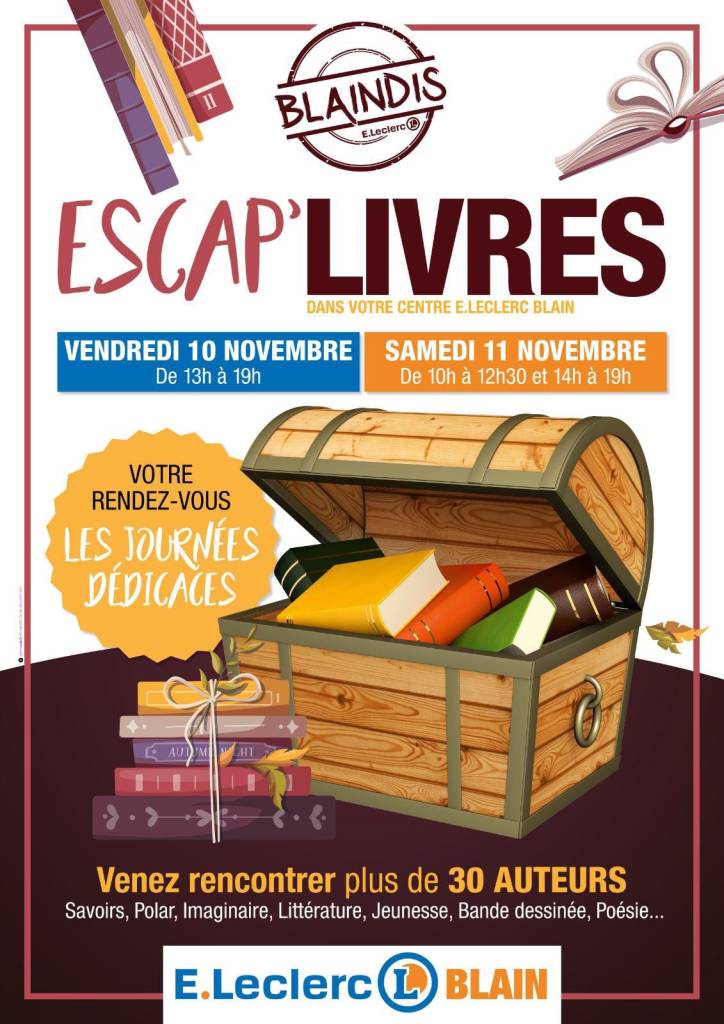 D’abord ESCAP’LIVRES à Blain le 10 et 11 novembre dans l’espace culturel Leclerc, avec une trentaine d’autres auteurs.